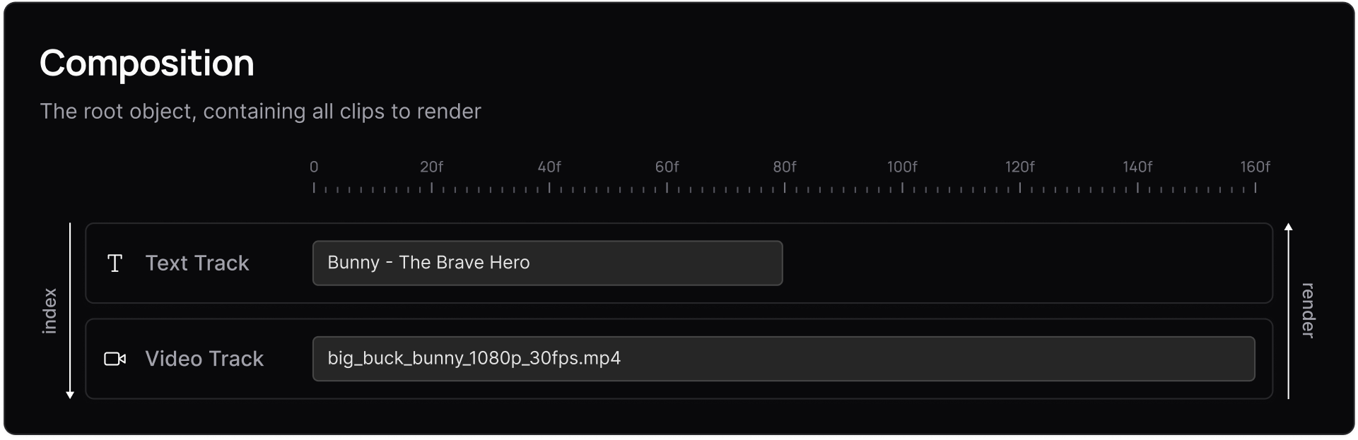new core.Encoder(composition, { fps: 25 }).render();This may look familiar to some. That is because the API is heavily inspired by Moviepy and Swift UI. It models the structure of popular video editing applications such as Adobe Premiere or CapCut. The current state can be visualized as follows: