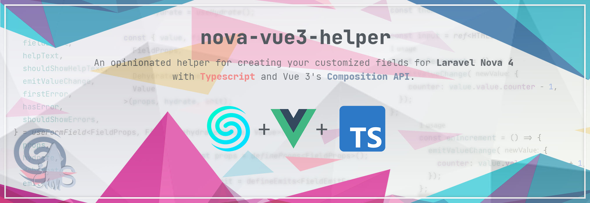 With this package you can simplify the development of your custom fields, tools and cards for Laravel Nova 4 while supporting Typescript and Vue 3's Composition API. Fully compatible with the latest Nova 4 features such as Repeater fields, dependent fields, etc.