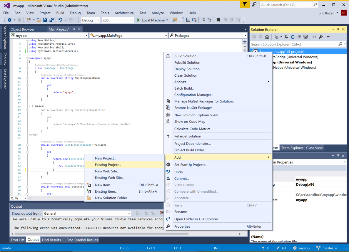 - Open your Visual Studio .sln (generally ./windows/app name.sln) file in Visual Studio 2015.