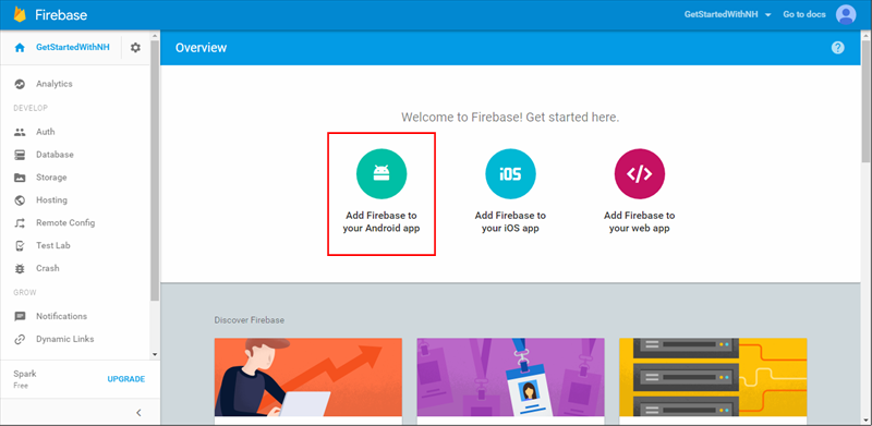 - After your project is created click Add Firebase to your Android app and folow the instructions provided.