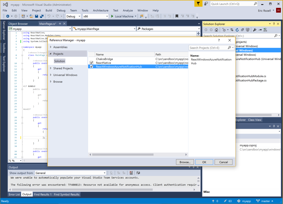 react-native-azurenotificationhubwith NPM, find and selectReactWindowsAzureNotificationHub.csprojin.\node_modules\react-native-azurenotificationhub\windows\ReactWindowsAzureNotificationHub. - Right-click the Windows Store app project, click Add > Reference, and check