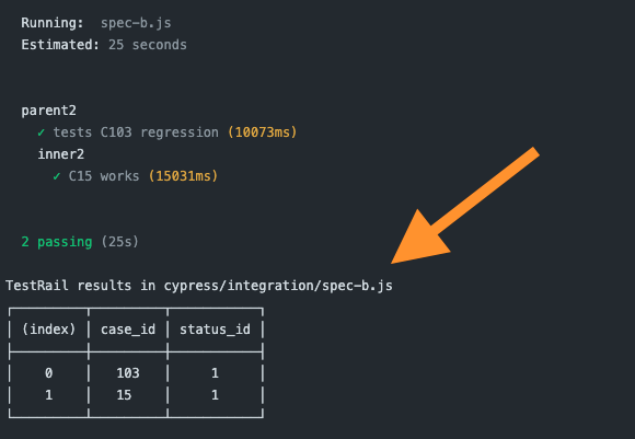 $ as-a . node ./bin/testrail-start-run.js --spec 'cypress/e2e/\*.js'Make sure this plugin is registered correctly in your cypress/plugins/index.js file and the plugin function is declared with the async keyword in v3. During the test run, you should see messages like this after each spec