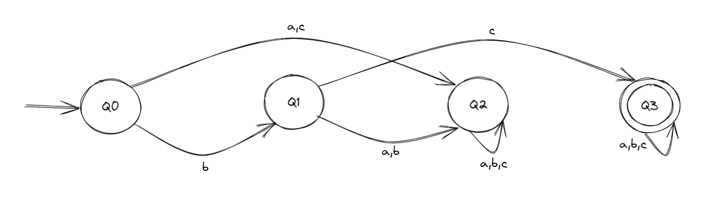 Lets start out with a simple dfa, that checks whether an input string starts with bc. The alphabets of the dfa are a, b, c