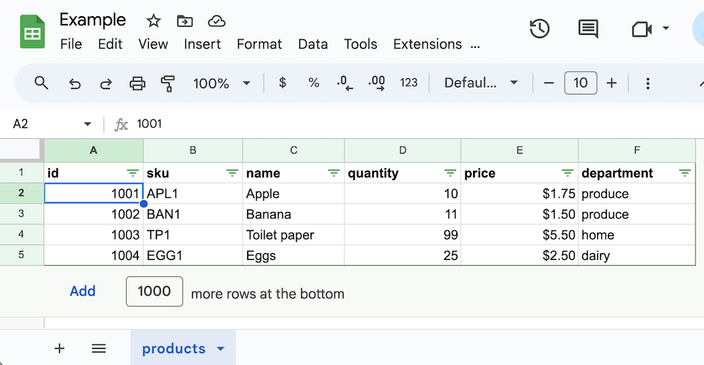 So imagine you have the following Google Sheets document that contains this products sheet: