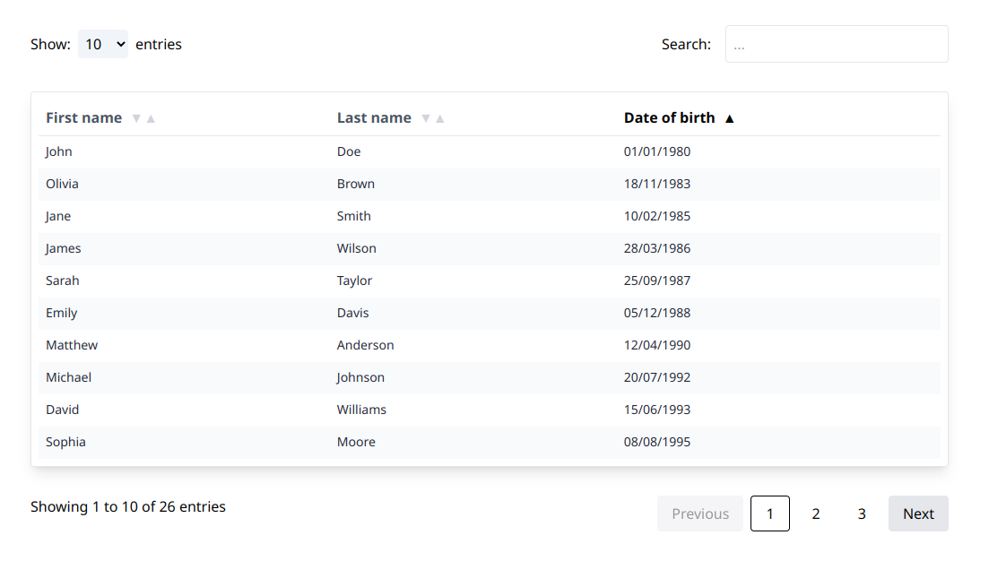 <Table<ItemType> headers={headers} items={items} sortBy="dateOfBirth" />⨠Interface