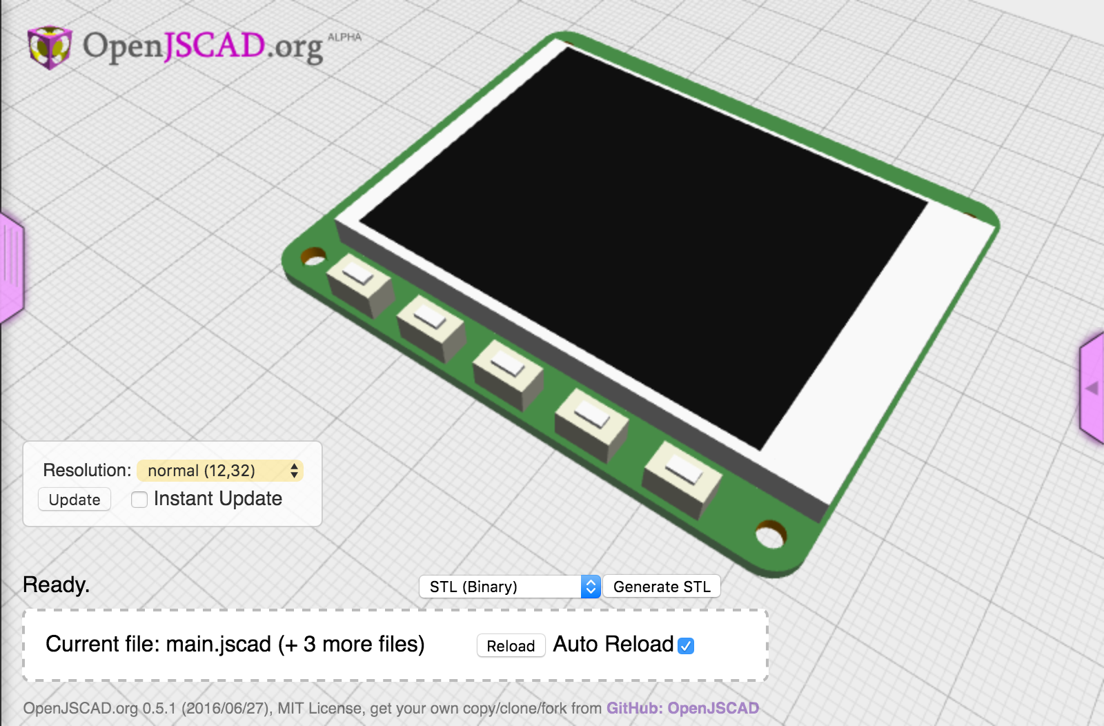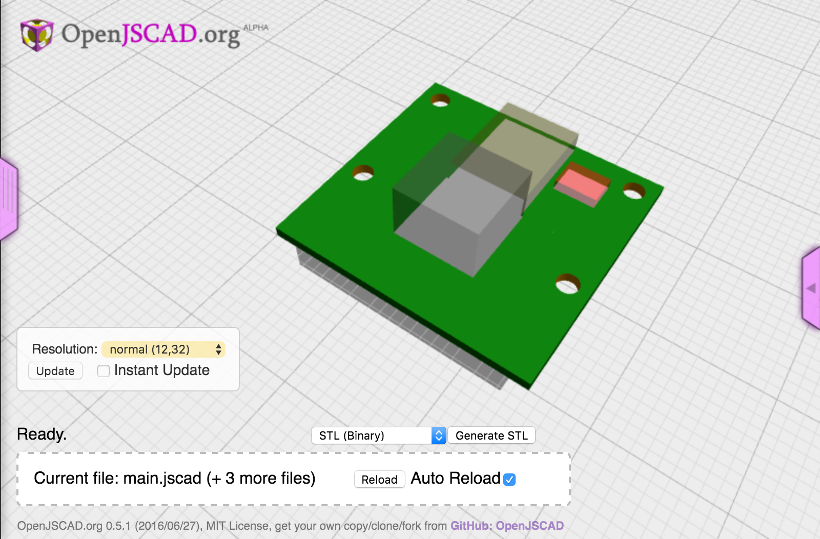 Once you create your project, install jscad-raspberrypi, and run gulp. Dragging the dist directory into http://openjscad.org/ will include this library.