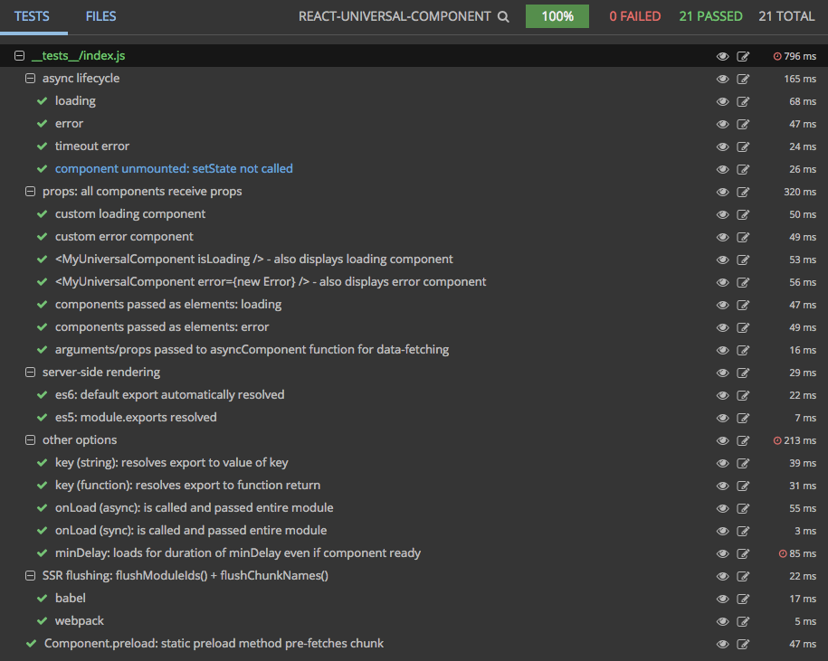 Below is a screenshot of this module's tests running in Wallaby ("An Integrated Continuous Testing Tool for JavaScript") which everyone in the React community should be using. It's fantastic and has taken my entire workflow to the next level. It re-runs your tests on every change along with comprehensive logging, bi-directional linking to your IDE, in-line code coverage indicators, and even snapshot comparisons + updates for Jest! I requestsed that feature by the way :). It's basically a substitute for live-coding that inspires you to test along your journey.