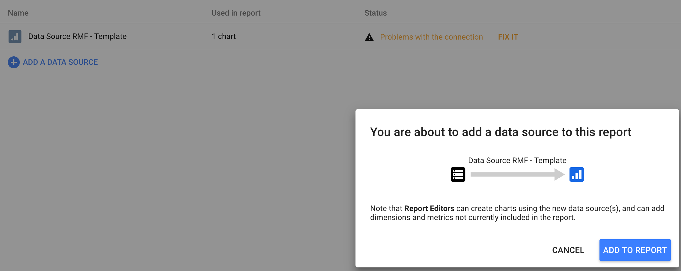 The next screenshots show how to add data sources. The first screenshot shows the first step in adding data to the GDS report. Choosing a data source, plain and simple, albeit to configure GDS to work optimally, you must either choose a dimension or add another "temporary" data source, then delete it, as shown in the second screenshot, because then you can save your added data source.