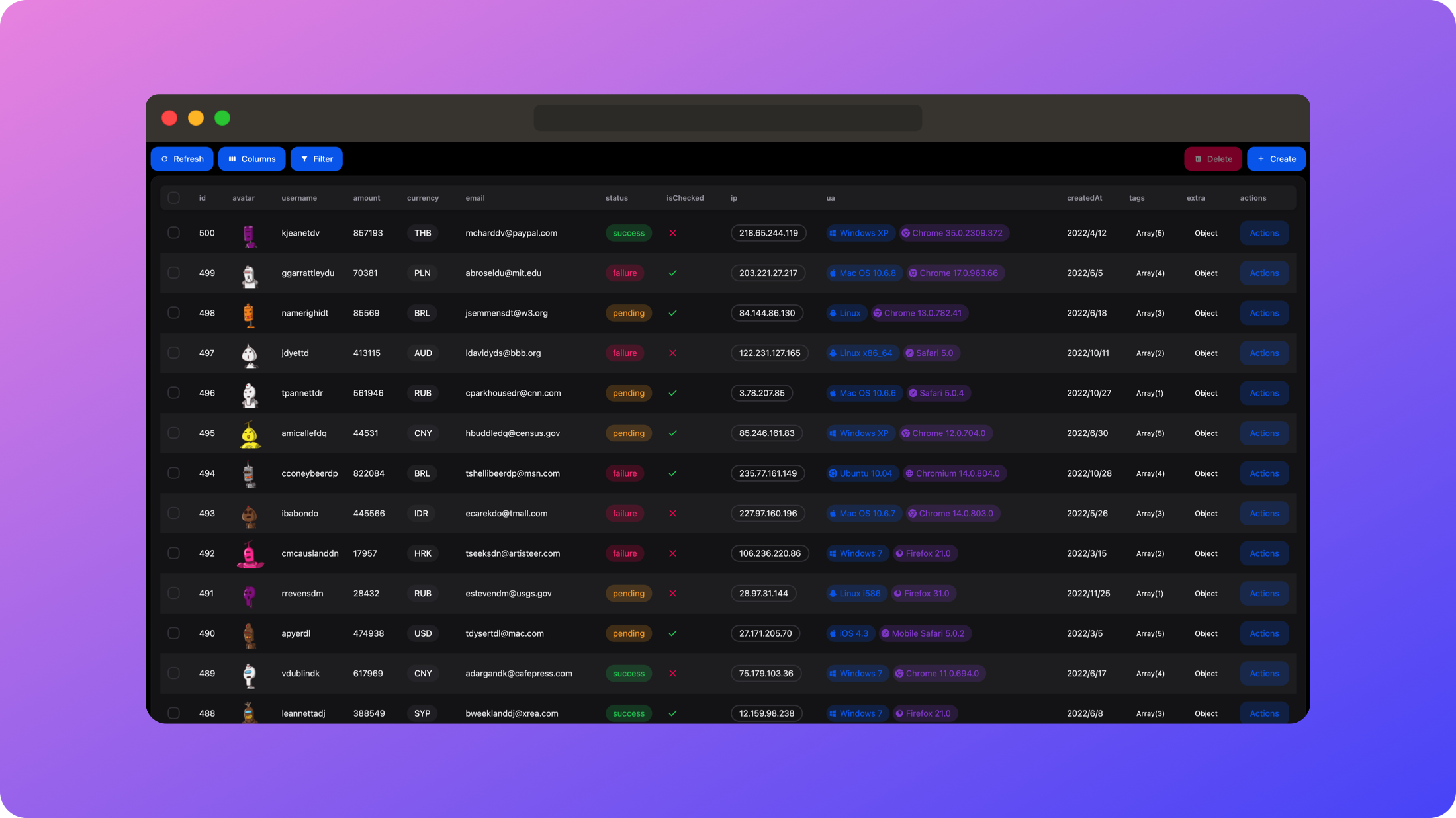 In other admin panel projects, you not only need to define various column data but also need to define many APIs for network request operations and use fetch or axios. However, with the support of Next.js's Server Actions, you can work without having to integrate APIs, just define a few functions and pass them into client components, and also have TypeScript type hints. When your business data structure changes, you only need to modify column definitions and related functions, which can generally be completed within a minute!