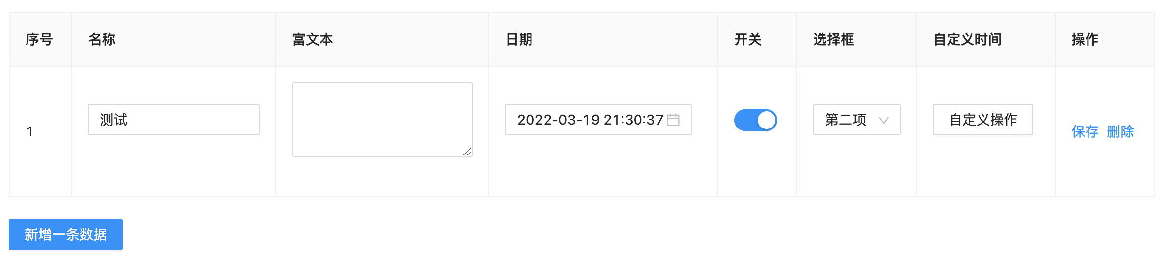 | isSingleSave | boolean | no | 是否单行保存,此模式每行数据都有保存按钮 |