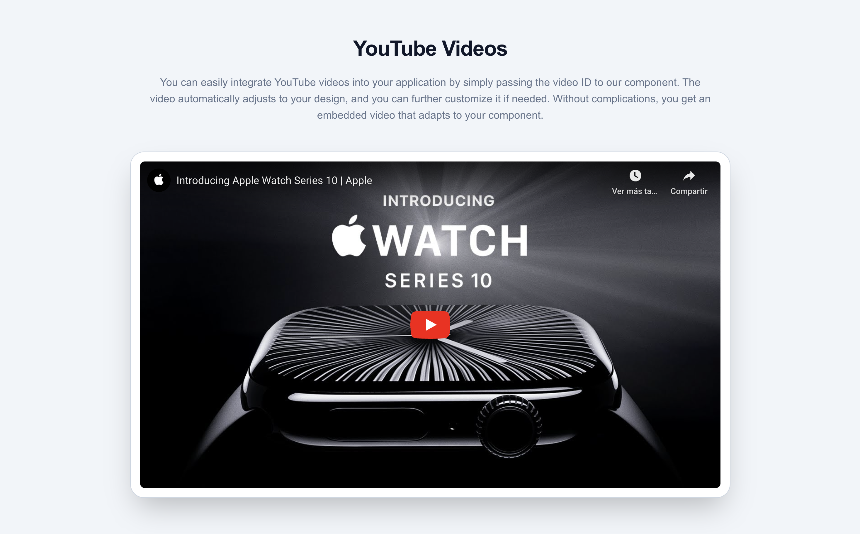 videoId(string, required): The YouTube video ID.mode(string, optional): Either'video'or'thumbnail'. Default is'video'.aspectRatio(string, optional):'16:9','4:3','21:9','1:1','9:16', or'3:2'. Default is'16:9'.borderRadius(string, optional): CSS border-radius value. Default is'0px'.style(object, optional): Custom inline styles.className(string, optional): Tailwind CSS or other class names for additional styling.