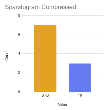 Unlike the traditional representation, the Sparstogram dynamically adapts itself in entries, resolution and range. A limit can be imposed on a Sparstogram through maxCentroids. Once that number of unique values has been reached, additional entries will results in compression so as not to exceed that many entries. Compression involves merging two adjacent entries into one, with a new mean, combined count, and a computed variance. The pair to merge are chosen based on least loss, which information is maintained in an internal index so as not to require searching for. Here is an illustration of the same Sparstogram, were we to set maxCentroids to 2, thus asking it to shrink to only 2 entries: