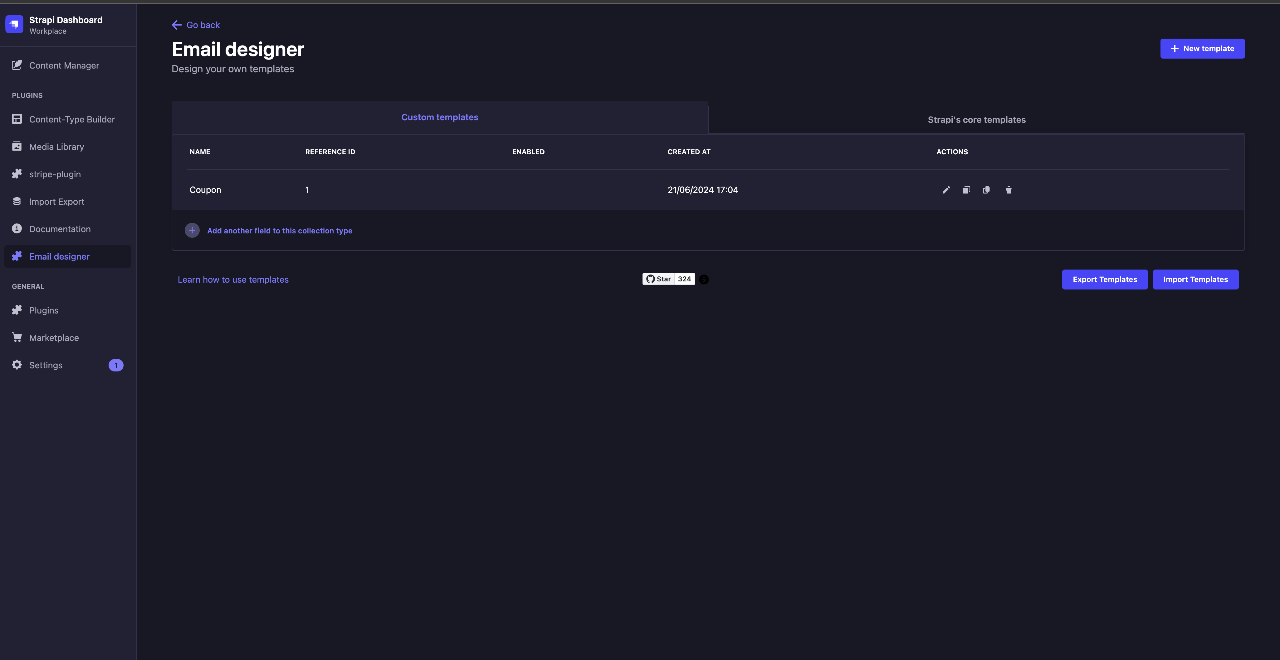 # file location .env SMTP_HOST=smtpdm.aliyun.com SMTP_PORT=465 SMTP_USERNAME=luca.li@test.com #'luca <luca.li@test.com>' SMTP_PASSWORD=123456// file location config/plugins.ts module.exports = ({ env }) => ({ email: { config: { provider: "nodemailer", providerOptions: { host: env("SMTP_HOST", "smtp.example.com"), port: env("SMTP_PORT", 587), auth: { user: env("SMTP_USERNAME"), pass: env("SMTP_PASSWORD"), }, // ... any custom nodemailer options }, settings: { defaultFrom: env("SMTP_USERNAME"), defaultReplyTo: env("SMTP_USERNAME"), }, }, }, });Install the strapi-plugin-email-designer plugin