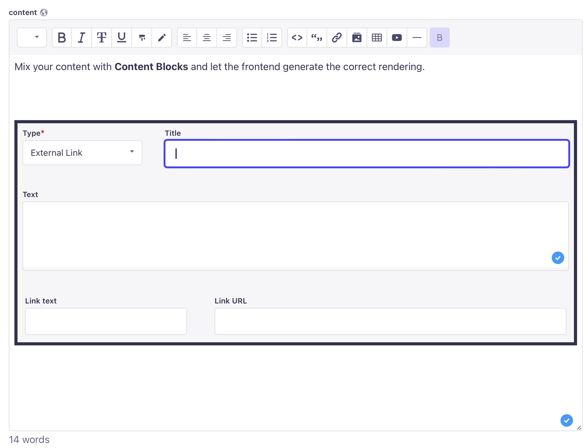 A content block is a structured content composed of different fields. It's a way to add more complex content in the content editor. It could be a "call to action" block, a "hero" block, or a "product" block.