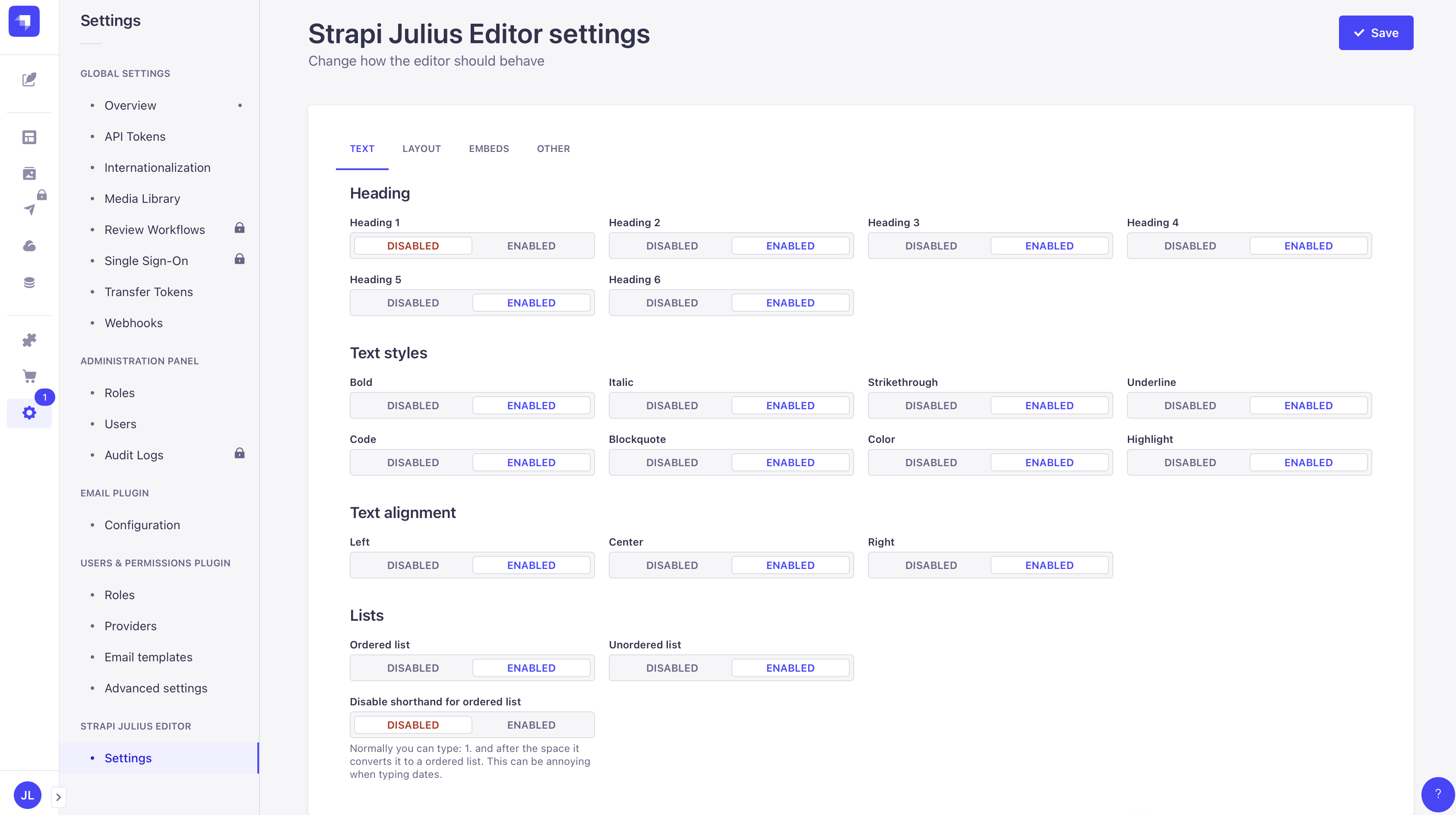 You should now be able to access to the editor settings in the Strapi admin.