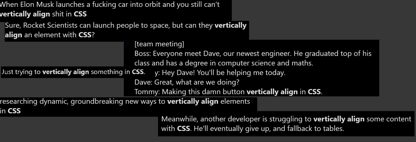 Seems like vertically align is still an issue? I still see a lot of people joking/complaining about this, so I guess this component will have an audience.